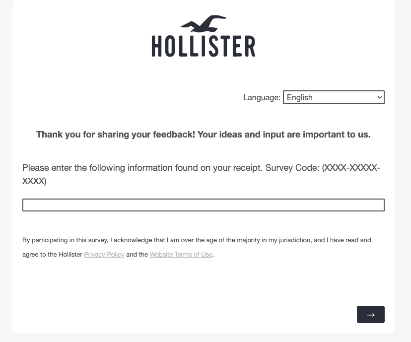 Grab your recent Hollister receipt – you’ll find a survey code printed on it. Enter the code to start the survey. - Answer the Survey Questions